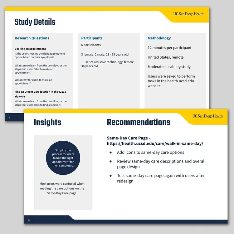 Skills Applied: Moderated research • Participant recruitment • Script development • Qualitative analysis • Design collaboration • Stakeholder presentation • Healthcare UX